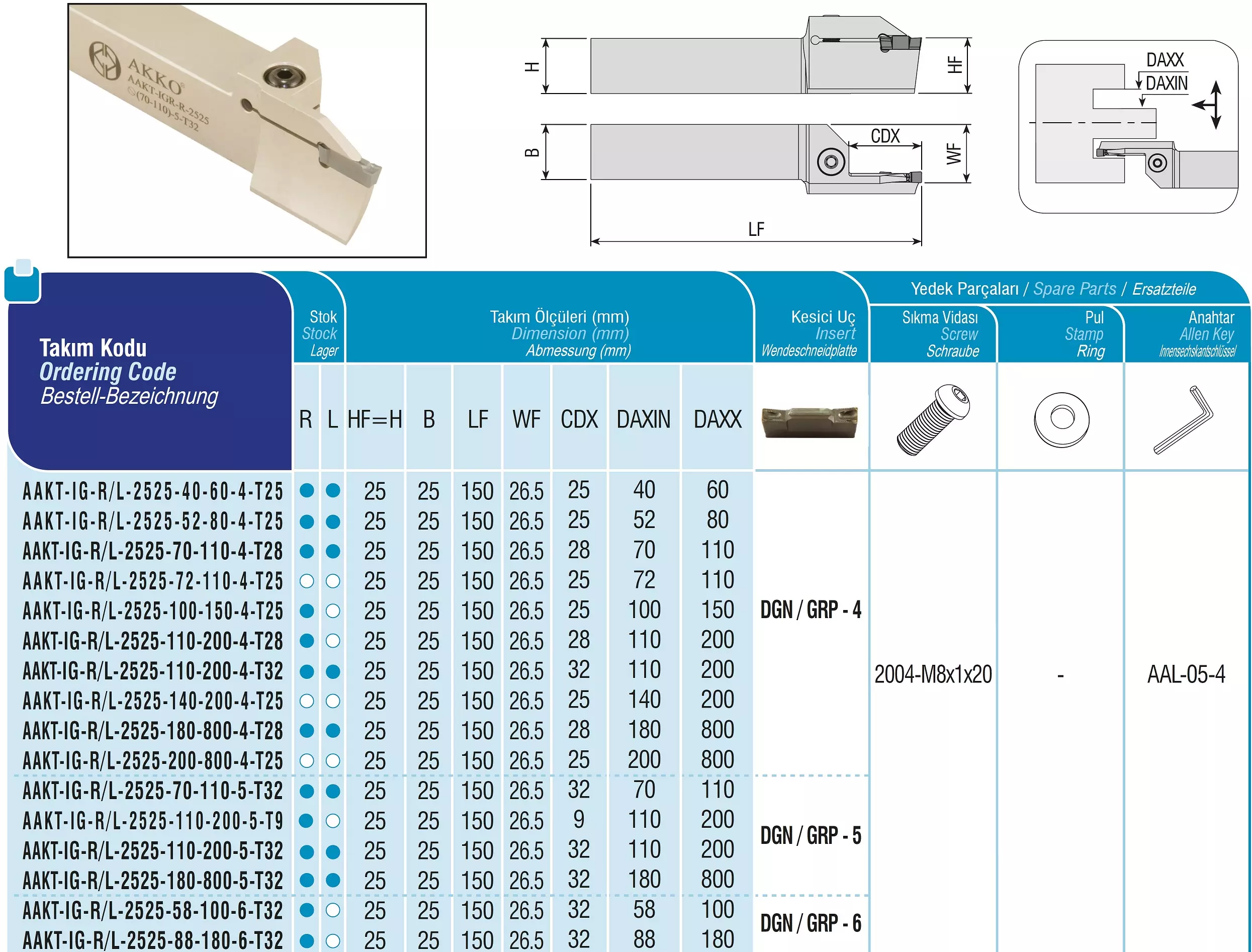 Produktinformationen "AKKO-Axial-Stechhalter, kompatibel mit Iscar-Stechplatte DGN / GRP-6 Schaft-ø 25x25, Einstechbereich ø 88 - ø 180 mm, rechts"