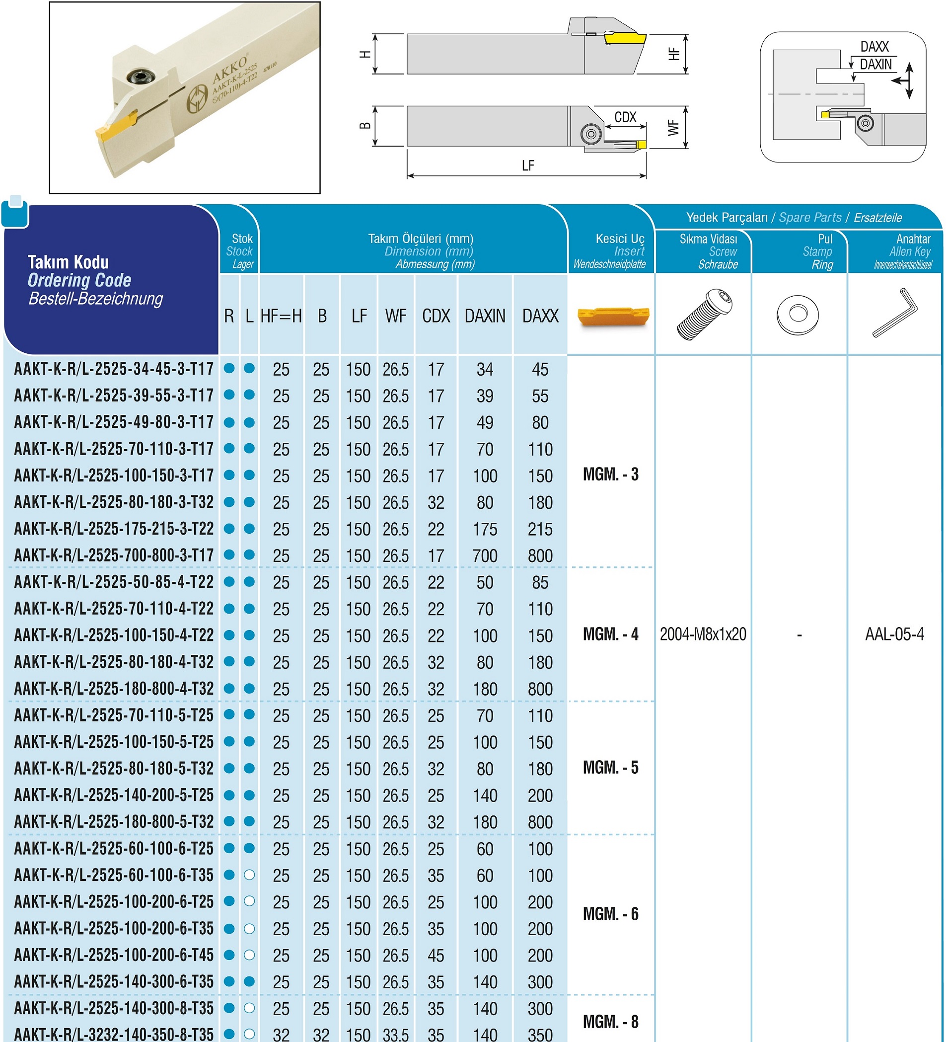 Produktinformationen "AKKO-Axial-Stechhalter, kompatibel mit Korloy-Stechplatte MGM.-3 Schaft-ø 25x25, Einstechbereich ø 70 - ø 110 mm, links"