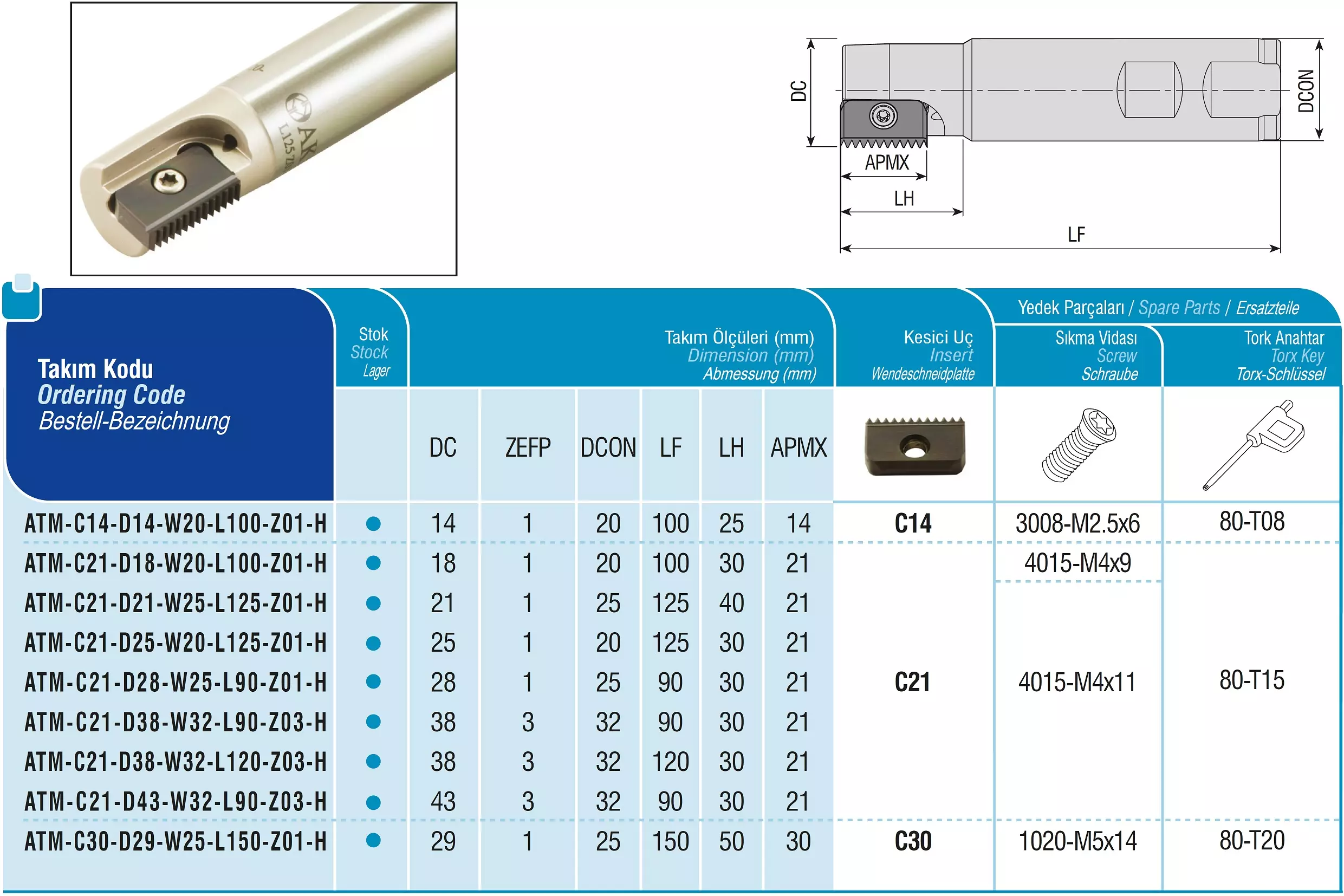 Produktinformationen "AKKO-Gewindefräser ø 29 mm, kompatibel mit CPT-Gewinde-Fräsplatte C30, Gesamtlänge = 150, mit Innenkühlung "