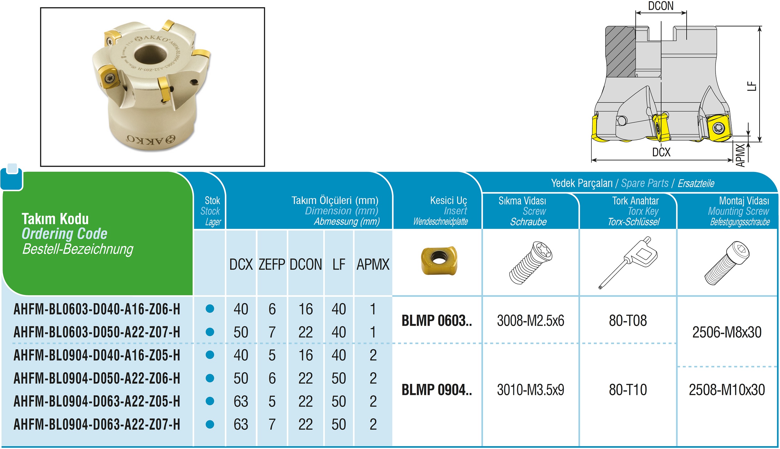 Produktinformationen "AKKO-Hochvorschub-Messerkopf für Wendeplatten, ø 50 mm, kompatibel mit Taegutec BLMP 0603.. Schaft-Ausführung ø 22 (Typ A), mit Innenkühlung, Z=7"