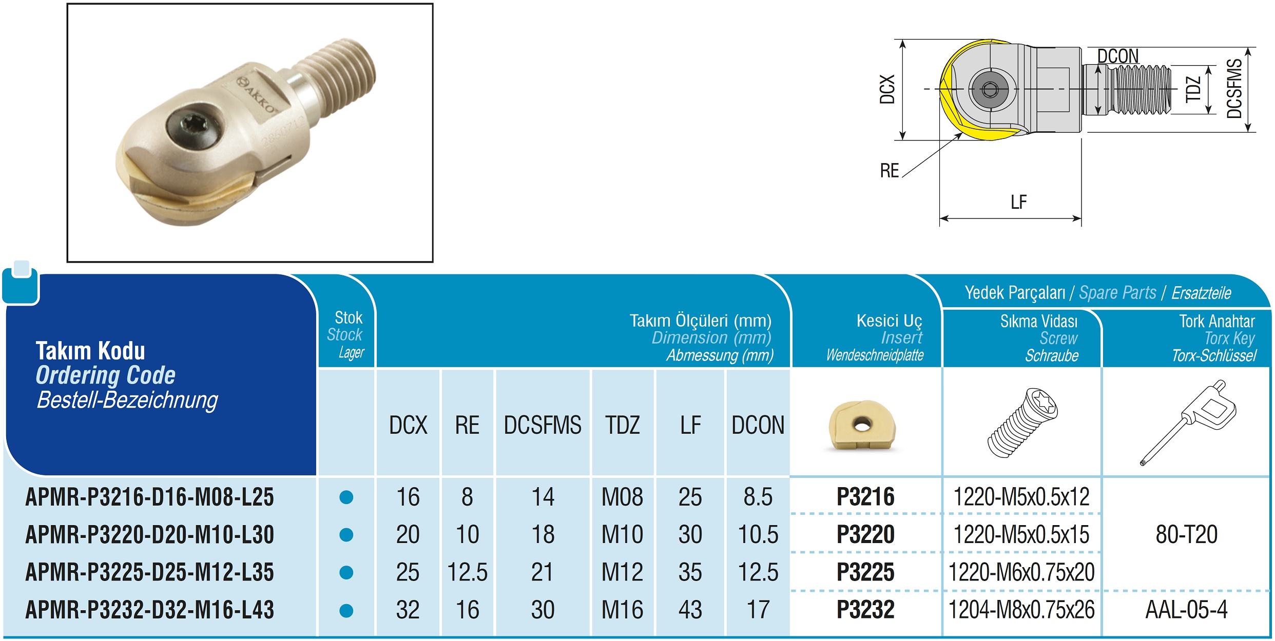 Produktinformationen "AKKO-Kugelkopier-Einschraubfräser für Wendeplatten, ø 32 mm, kompatibel mit Walter P3232 und LMT/Kieninger WPR32 Schaft-ø M16, ohne Innenkühlung"