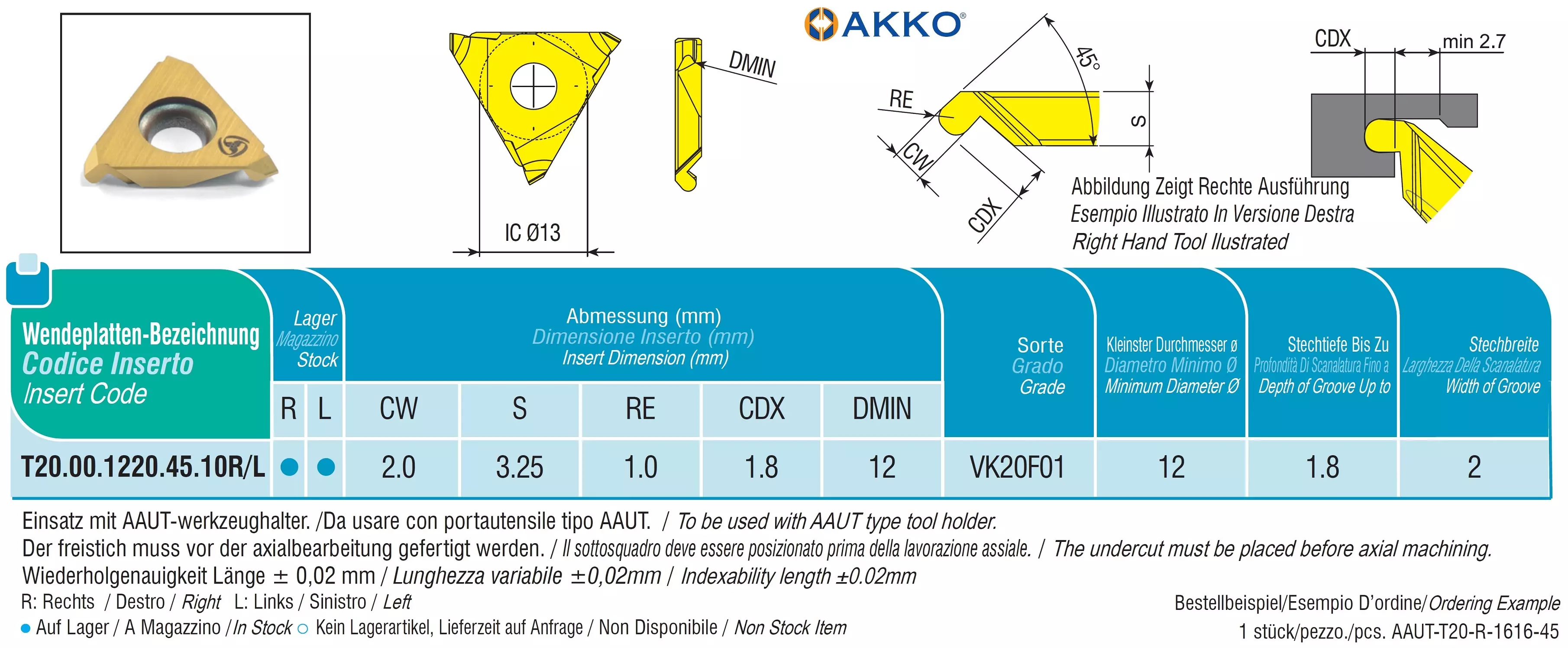 Produktinformationen "AKKO-Wendeplatten für axiale Freistiche, Stechbreite = 2.0 mm, Stechtiefe = 1.8 mm, Eckenradius = 1.0 mm, Hartmetallsorte VK20F01 rechts"