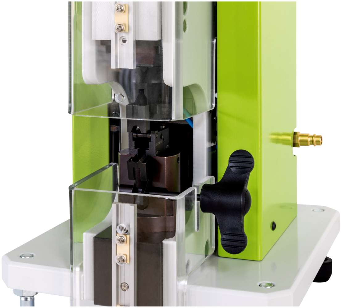 - Konstruktiv ist die Maschine so ausgelegt, dass Isolationscrimp, Abschirmcrimp, Zugentlastungscrimp und Kontaktcrimp in einem Crimpeinsatz ausgeführt werden.