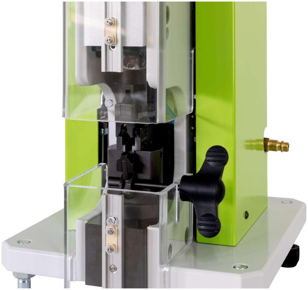 - Konstruktiv ist die Maschine so ausgelegt, dass Isolationscrimp, Abschirmcrimp, Zugentlastungscrimp und Kontaktcrimp in einem Crimpeinsatz ausgeführt werden.