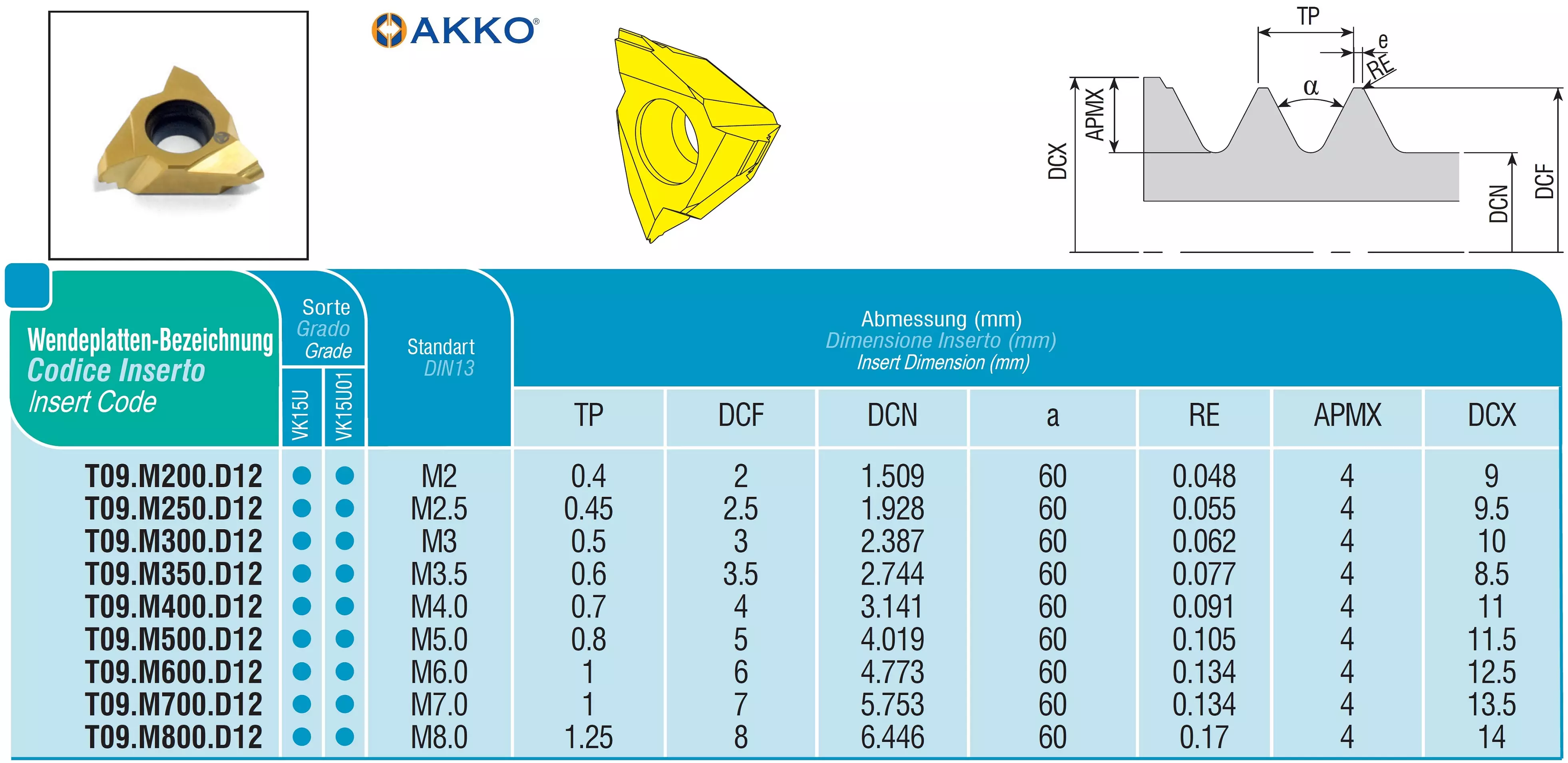 Produktinformationen "AKKO-Wendeplatte zum Gewindewirbeln, Steigung TP = 1 mm, α = 60 Hartmetallsorte VK15U01 (beschichtet)"