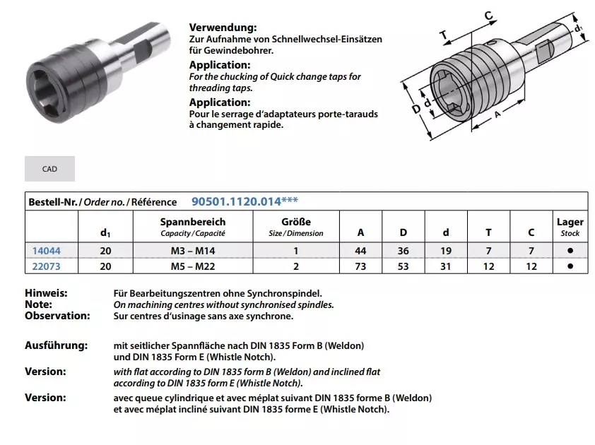 Produktinformationen "Gewindeschneid-Schnellwechselfutter mit Längenausgleich auf Druck und Zug für Zylinderschäfte DIN 1835 B + E"