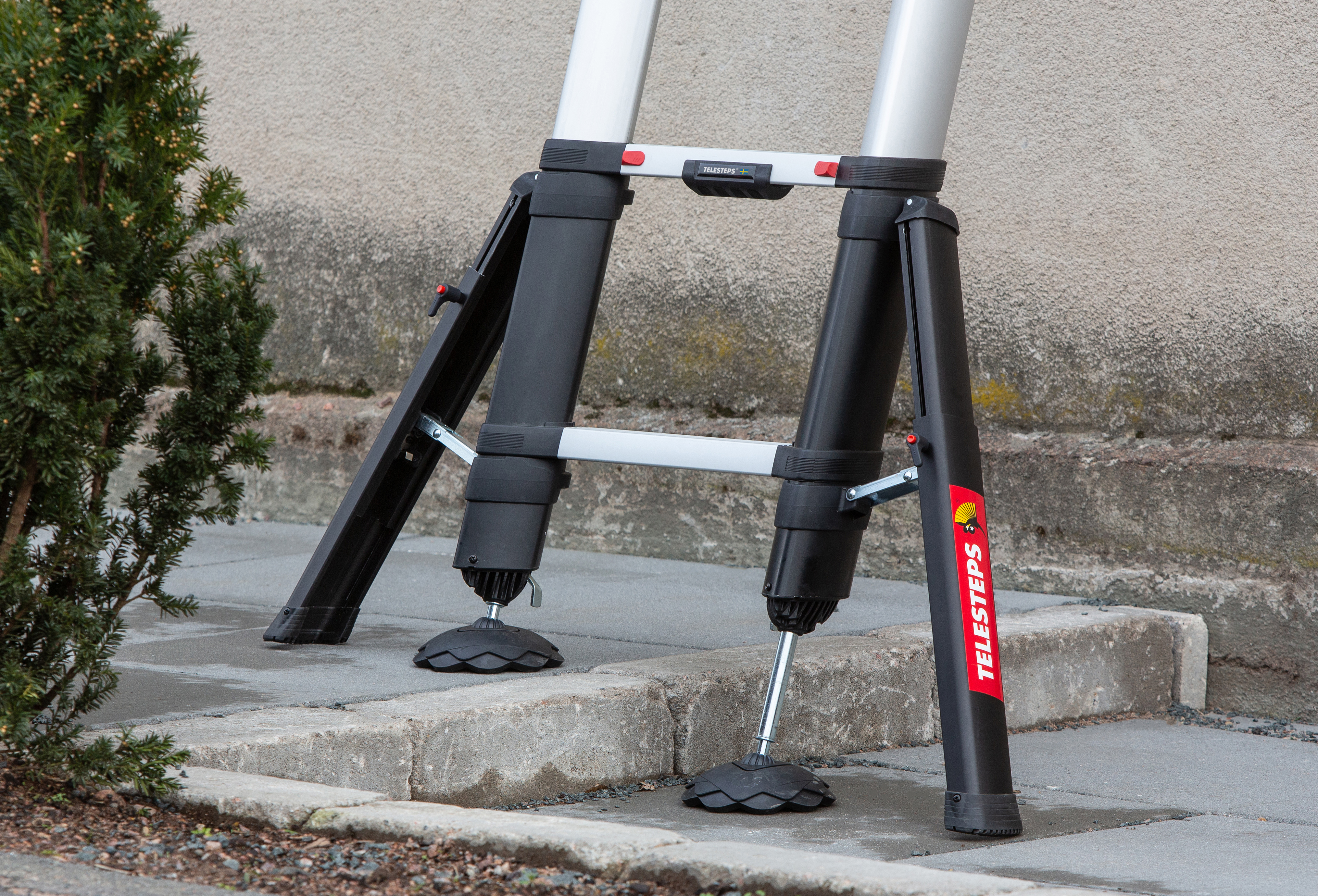 Die Telesteps Höhenverstellung für die 4,10 m Anlegeleiter mit Stabilisator sorgt für höchste Sicherheit und Stabilität auf unebenen oder abschüssigen Untergründen. Die verstellbaren Sicherheitsfüße ermöglichen eine präzise Anpassung und gewährleisten vollen Bodenkontakt. Dank des patentierten Kugelgelenks wird der Kontakt zur Oberfläche maximiert, während die großen Gummiteller für eine außergewöhnliche Haftung sorgen.