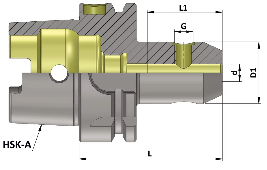 | Artikelbezeichnung | Artikelcode | HSK-A | d | D1 | G | L | L1 | Anzahl Schrauben |