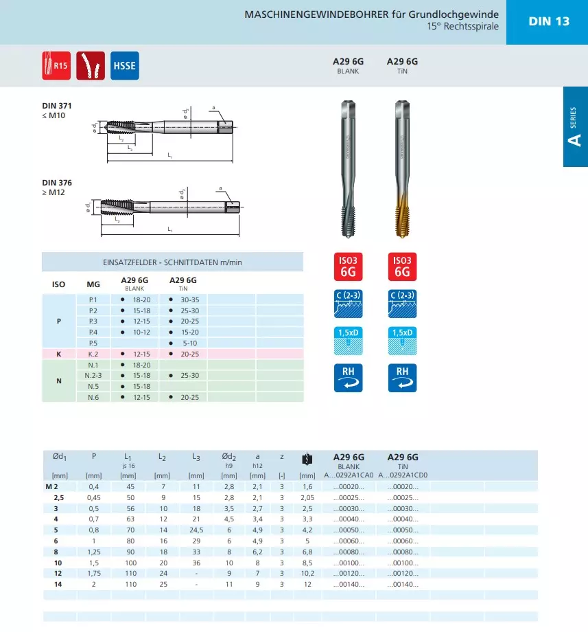 Produktinformationen "Maschinengewindebohrer HSSE 15° Rechtsspirale A29 6G "