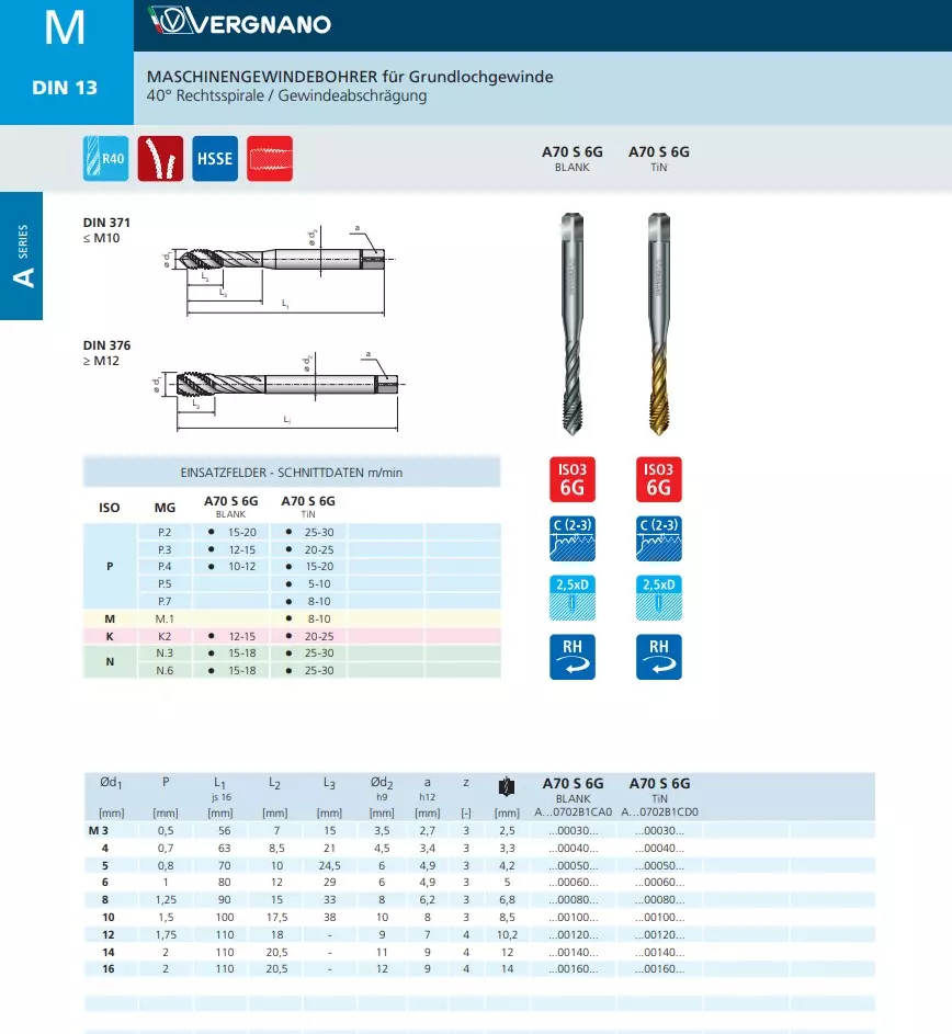 Produktinformationen "Maschinengewindebohrer HSSE 40° Rechtsspirale/Gewindeabschrägung A70 S 6G"
