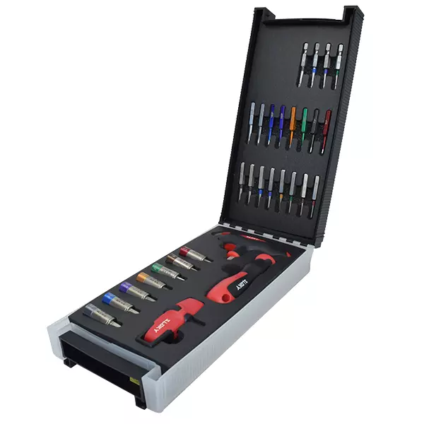 MASTER KIT DREHMOMENTSCHRAUBENDREHER TSD-17 von SLOKYMASTER KIT mit universellen, geraden und T-fliegenden Griffen und 7 Drehmomentadaptern (0,6 ~ 6 Nm) sowie 20 farbcodierten 50-mm-Bits (Torx, Torx Plus und Sechskant) erhältlich. (TORX® und TORX PLUS® sind beide eingetragene Warenzeichen von Acument Global Technologies LLC.) Merkmale Lassen Sie sich durch CLICK sagen, wann das Drehmoment erreicht ist! Schnelles Wechseln der Bits! Ziehen Sie den Bit einfach nach außen, um den neuen Bit zu wechseln. Perfekte Positionierung der Bits. Ein sicherer Halt, den Sie nie bezweifeln werden! Ein Präzisions-Drehmomentwerkzeug ist nur so gut wie seine Ergebnisse. Mit geeigneten Prüfgeräten und -systemen können wir sicherstellen, dass Sie die Genauigkeit und Qualität unserer Produkte nie in Frage stellen müssen. Zum Auf- und Zudrehen von Torx oder Inbusschrauben in Trägerwerkzeugen. Spezifikation: TSD-17 enthält Universal-, Slim-Flit- und T-Fluggriffe, 7 Stück Drehmomentadapter, 20 Stück 50-mm-Torx/Torx Plus-Bits/Sechskant. Die Größen sind TX6, TX7, TX8, TX9, TX10, TX15, TX20 und TX25 für Torx und 6IP, 7IP, 8IP, 9IP, 10IP, 15IP, 20IP und 25IP für Torx Plus. Die entsprechenden Drehmomente sind 0,6, 0,9, 1,2, 1,4, 2,0, 3,0, 5,0 und 5,5 Nm, was 5,3, 8,0, 10,6, 12,4, 17,7 und 26,6 In-lb entspricht. (Drehmomente sind für Torx- und Torx Plus-Systeme gleich) Der T-Typ Universalgriff ist 2 3/4" x 3/4" x 1 1/2" (LXWXH) und der kleine HD-Griff mit weichem Griff ist 4" Zoll Länge und 1 1/4" im Durchmesser. Die Drehmomentadapter mit voreingestelltem Industriestandard-Drehmoment sind magnetisiert und farbcodiert. Die Bits aus hochlegiertem Stahl sind ebenfalls magnetisiert und farbcodiert mit einer Härte von 58-60 HRC. Inhalt: Fall x 1 Griff x 3 Drehmomentadapter x 7 50-mm-Bits x 20