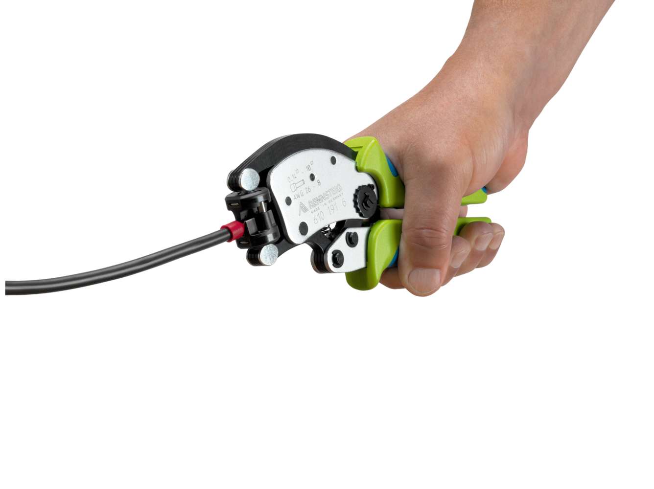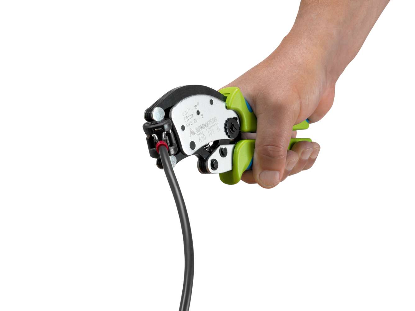 - gleichbleibend hohe Crimpqualität durch Zwangsvollendung des Crimpvorganges (entriegelbar)