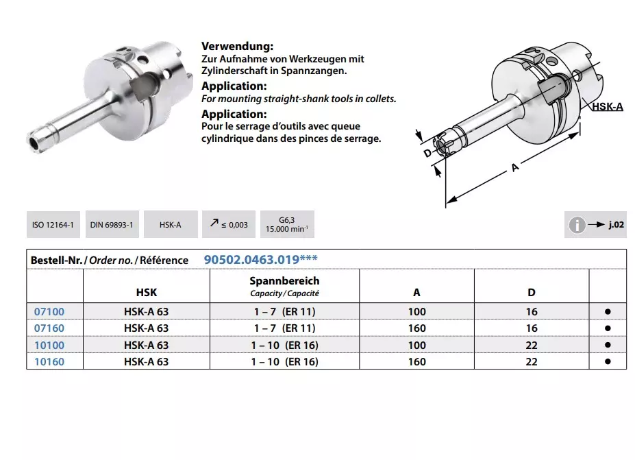- ISO 12164-1 / DIN 69893-1 / HSK-A / Rundlaufgenauigkeit ≤ 0,003 / G6,3 15.000 min