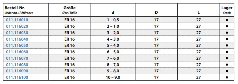 Spannzangen DIN 6499 B (ISO 15488 B) System ER 16 Rundlaufgenauigkeit 0,015