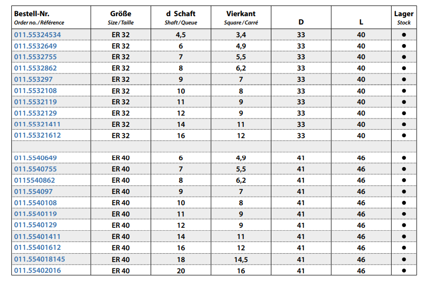 Spannzangen mit Kühlkanalbohurgen DIN 6499 A (ISO 15488 A) System ER, mit Innenvierkant für Gewindebohrer