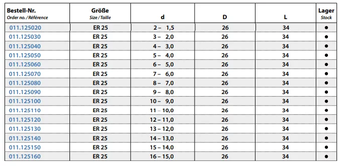 Spannzangen DIN 6499 B (ISO 15488 B) System ER 25 Rundlaufgenauigkeit 0,015