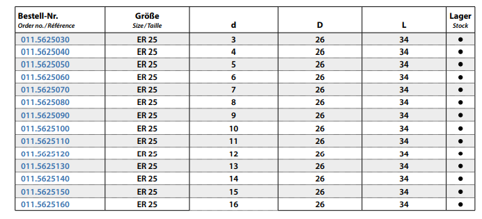 Spannzangen für Hochdruckkühlung 120 bar, abgedichtet mit IK DIN 6499 B (ISO 15488 B) System 25 Rundlaufgenauigkeit 0,015