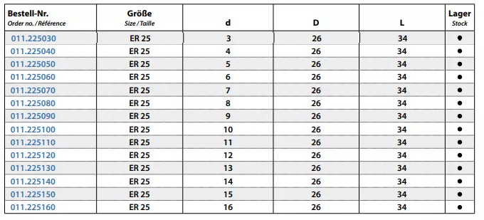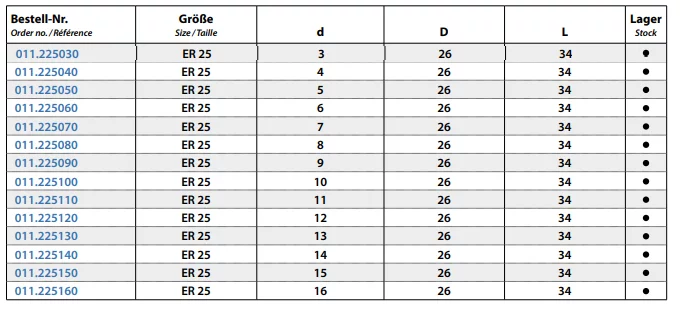 Spannzangen mit Abdichtung für IK DIN 6499 B (ISO 15488 B) System ER25 Spanngenauigkeit 0,015