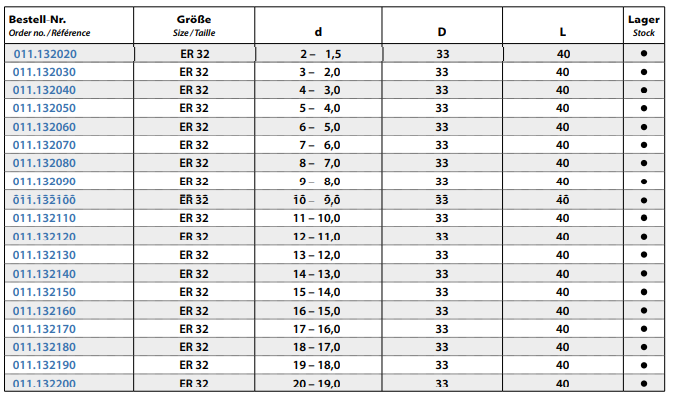 Spannzangen DIN 6499 B (ISO 15488 B) System ER32 Rundlaufgenauigkeit 0,015