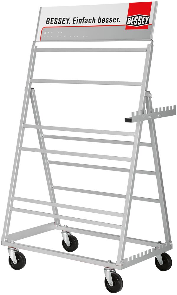 Sehr stabile Metallkonstruktion auf Rollen Maße 100 x 60 x 153 cm Hält bis zu 120 Zwingen, sogar lange Schraubknechte Temperguss- und Ganzstahlzwingen mit Spannweiten zwischen 200 und 2000 mm Mit Schild und Schildhalter Als Verkaufshilfe und für den Werkstattbereich geeignet