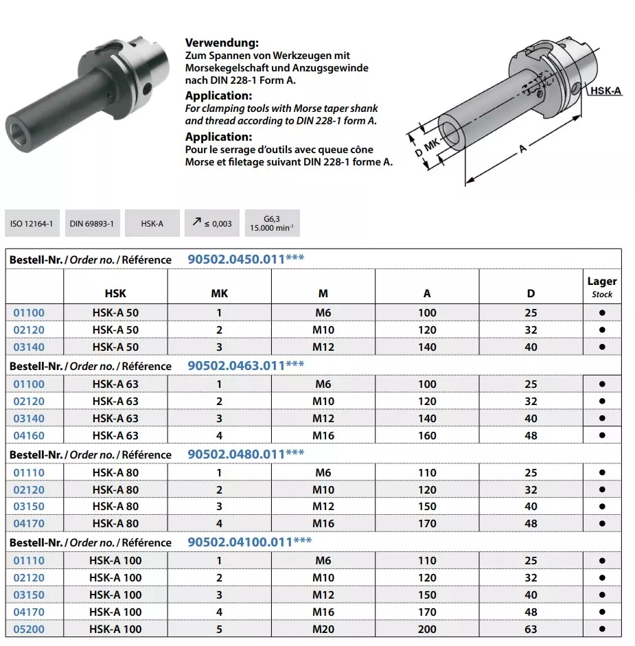 - ISO 12164-1 / DIN 69893-1 / HSK-A / Rundlaufgenauigkeit ≤ 0,003 / G6,3 15.000 min