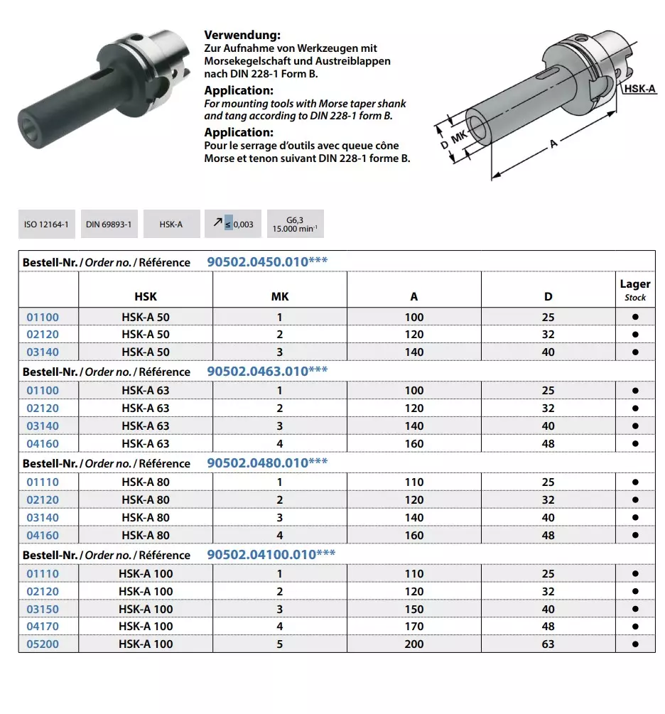 - ISO 12164-1 / DIN 69893-1 / HSK-A / Rundlaufgenauigkeit ≤ 0,003 / G6,3 15.000 min